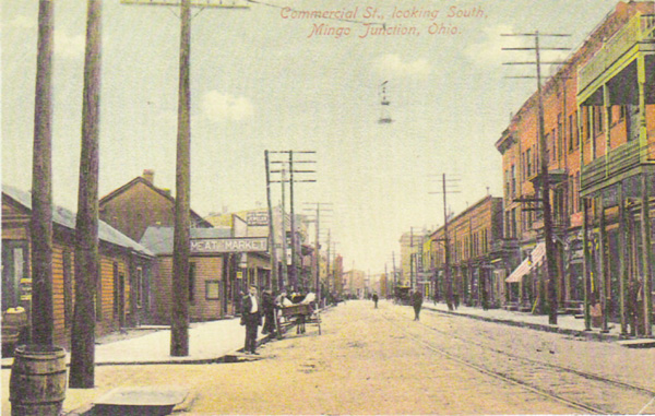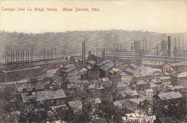 “Mingo Junction” As it is now named, is at present the site of a thrifty and prosperous village, designed for a town in the near future. The location referred to, including the property known as Potter’s farm, and also the Mean’s farm, was purchased, to the extent of six hundred acres, in 1800, bu the Rev. Lyman Potter, and his son-in-law, Mr. Jasper Murdock, the former, at the time, being a missionary from the Presbyterian church through Ohio and Pennsylvania. At his death the property was divided into two farms. . . . Daniel [Potter] Jr., at present a lumber merchant in Steubenville, in company with Mr. Abrahams, and Mr. Robert Sherrard, banker also of Steubenville, were made executors of the estate. These gentlemen, under date of June 1871, engaged the services of a surveyor, who laid out the land, consisting of forty-five lots. Mr. Elisha P. Potter next opened up an addition of twenty-five lots. . . . while in December, 1872, Mr. D. Potter and Mr. R. Sherrard, further added a second addition of forty-seven lots—this making the sum total of one hundred and seventeen lots submitted for building upon. It was the fact of the fine iron works being erected at this point that induced the idea of laying out a town, which works run successfully down to 1878, then stood idle for a considerable time, but opened up again brighter than ever in September last, under a new firm known as Mingo Iron Works Company. In 1872, a neat frame Presbyterian church was put up, at a cost of $2,500 at which the Rev. S. Forbes at present [1880] officiates, while the M. E.[Methodist] Church has also a mission here. A very nice public school was built in 1873, at a cost of $3,000, and is well attended. For several years lots sold freely, and fetched good prices, but in consequence of the recent stoppage of the iron works for some twelve to eighteen months, the real estate market in that locality has been exceedingly inactive—a state of affairs, however, that does not appear likely to continue. Nor should we [o]mit to state that about 1871-1872, there was a neat railroad depot erected here, at which there is express and Western Union telegraph agencies, and accommodations for passengers traveling the Cleveland and Pittsburgh or Pittsburgh, Cincinnati and St. Louis railroads, while the station house is used for a post office, Mr. Robert Turner being in charge of the united departments conducted in the building. The iron works company have a mine in operation, with a shaft 238 feet deep, near the depot, which produces an excellent quality of coal from veins varying from two feet to three feet in thickness. On the Means farm there is also a capital drift mine, hence there is no lack of fuel in the neighborhood. In the village there is a hotel, run by mine host A. Carson, and there are also several stores—including a dry goods and notion house by Mrs. Hirshfield, a grocery and dry good store by Mr. David Simpson, and groceries by Mrs. McClusky, P. Goff, &c. In fact, with it railroad and river facilities, an ample supply of coal and abundant excellent water—ready access to Steubenville, and the advantage of a most healthy location, teeming with historical associations, we see every reasonable prospect of this favored spot of centuries ago, yet securing equal popularity in future with certainly enjoyed in the past.